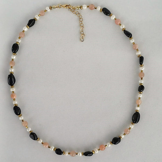 Dames ketting met onyx, zonnesteen en zoetwaterparels