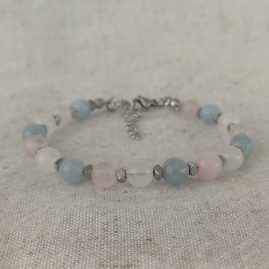 RVS armband met rozenkwarts, witte kwarts & blauwe kwarts – zachte harmonie