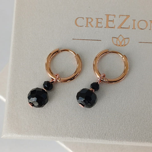 Rosé gouden RVS oorringen met zwarte onyx – elegantie met een edge