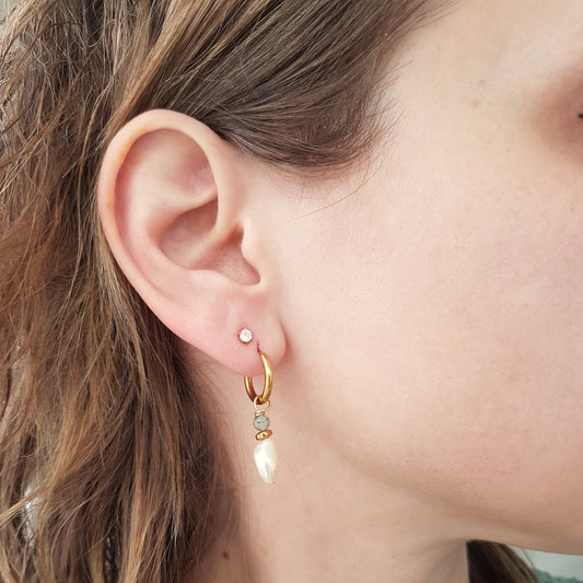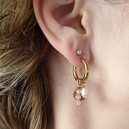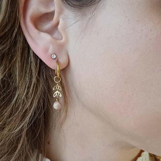 RVS oorbellen met zoetwaterparel, zonnesteen en gehamerd schijfje