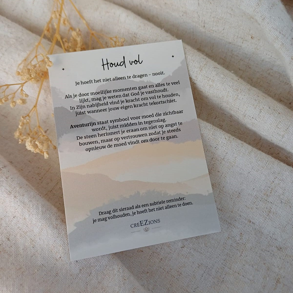Aventurijn staat bekend als steen van doorzettingsvermogen — een subtiele herinnering dat je sterker bent dan je denkt, en dat je stap voor stap verder mag gaan, zelfs wanneer de weg zwaar is.