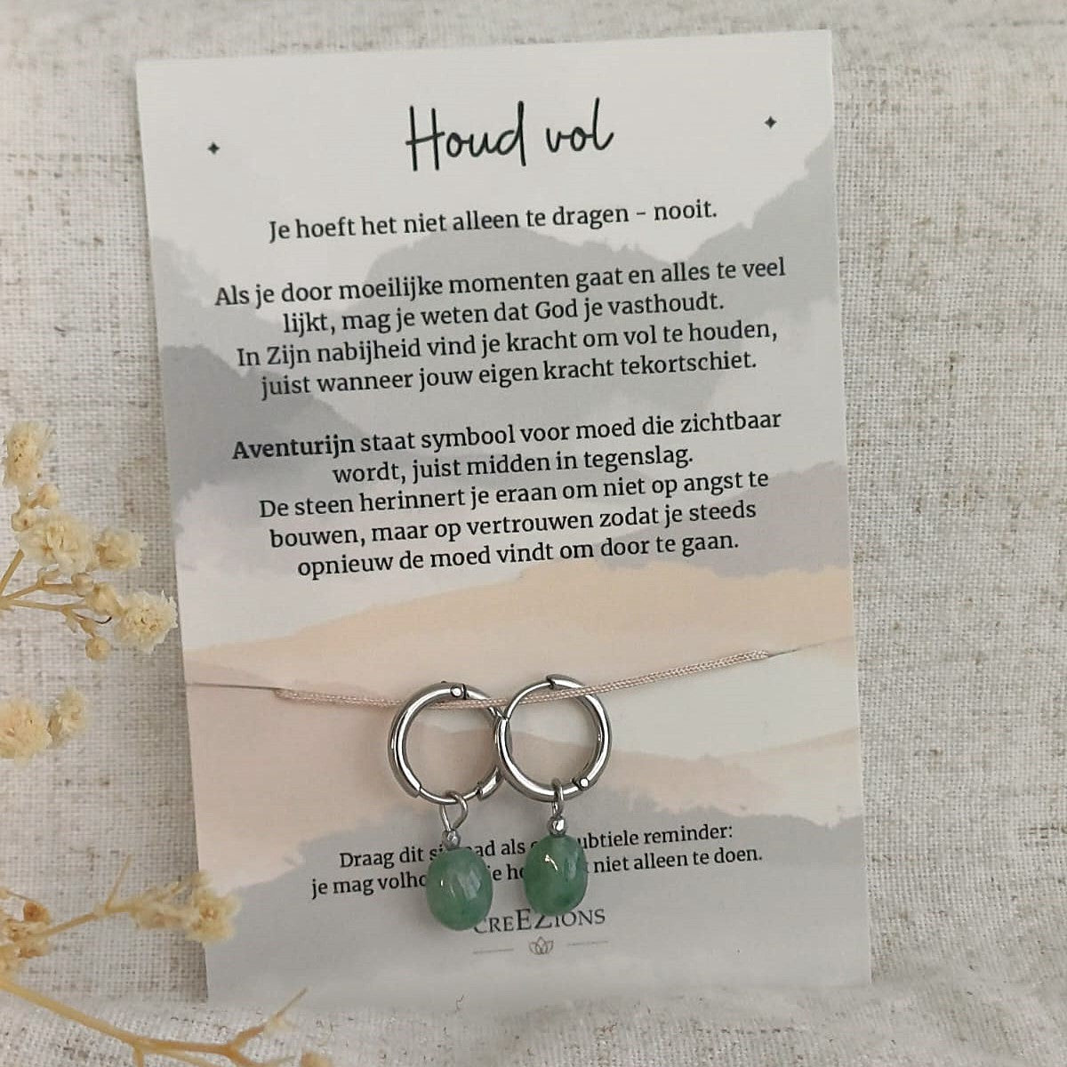 Deze oorbellen uit de Houd Vol-collectie brengen een krachtig maar zacht statement met zich mee. De natuurlijke groentint van aventurijn en de moderne RVS oorringen vormen samen een stijl die rust én moed uitstraalt.