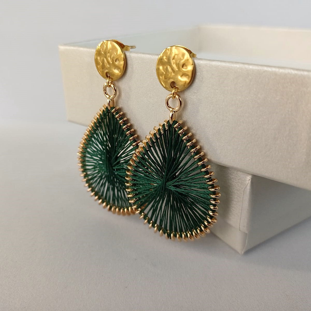 De ronde, goudkleurige stekers zijn gemaakt van RVS (roestvrij staal) – duurzaam, huidvriendelijk en stijlvol. De druppelvormige hangers zijn subtiel gedetailleerd met strak gespannen, donkergroen draad dat een opvallend grafisch patroon vormt. Deze RVS oorbellen dragen comfortabel en zijn een echte statement piece.